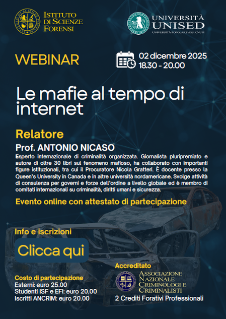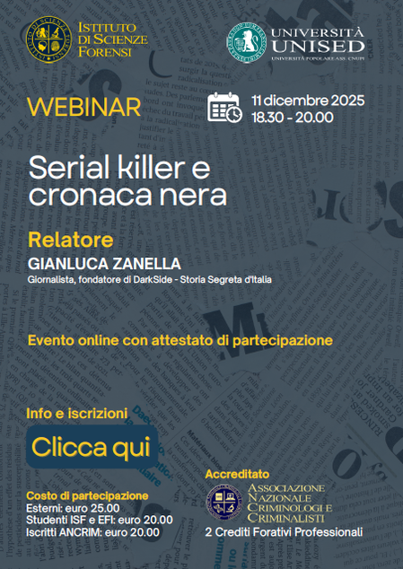 Evento in presenza organizzato dall'Associazione Nazionale Criminologi e Criminalisti (n. 20 crediti formativi professionali) in collaborazione con l'Istituto di Scienze Forensi.