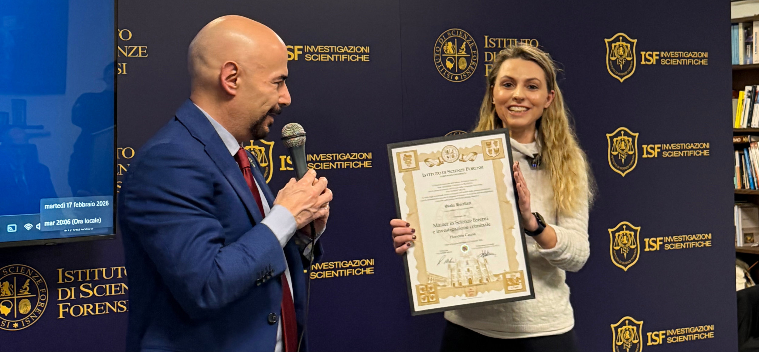 Al termine della Lectio Magistralis, l’Istituto di Scienze Forensi, nelle persone del direttore generale, prof. Massimo Blanco, e del preside della Corporate University, prof. Robert Milne, ha conferito all’Avv. Giada Bocellari il Master Honoris Causa in Scienze forensi e investigazione criminale “in virtù degli eccezionali meriti conseguiti nell’ambito della professione forense e per la straordinaria capacità di integrare le Scienze e le tecniche dell’investigazione criminale nella pratica del Diritto penale”.