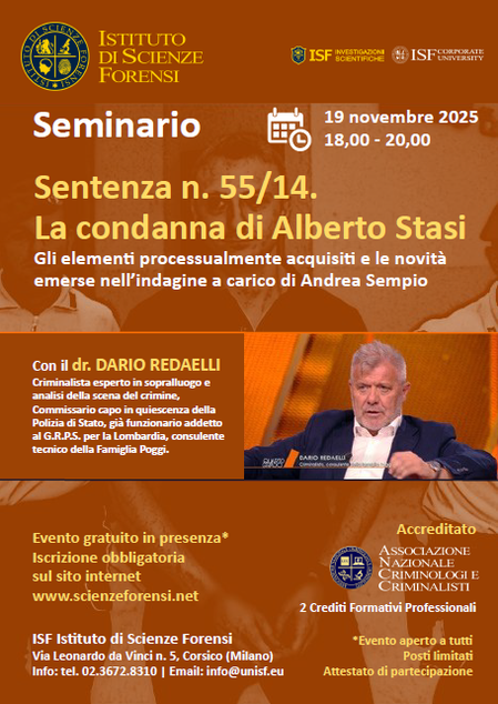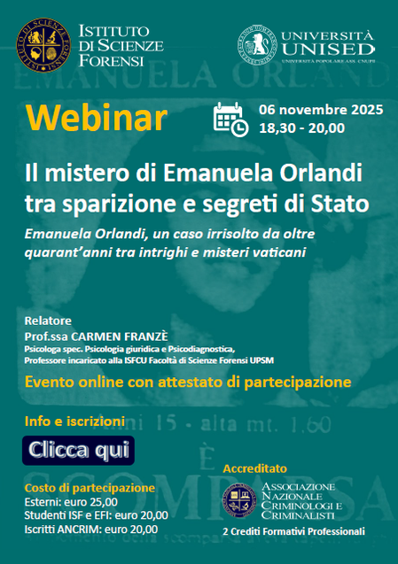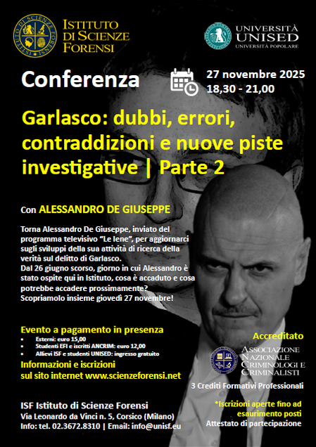 Evento in presenza organizzato dall'Associazione Nazionale Criminologi e Criminalisti (n. 20 crediti formativi professionali) in collaborazione con l'Istituto di Scienze Forensi.
